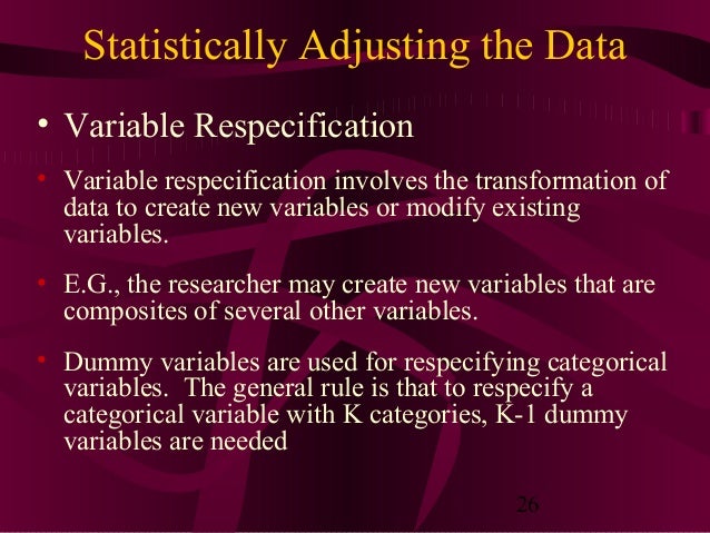 Dummy Variable: Generally used to refer to a dis-crete variable that can take the values 0 or 1. Example: Woman. 3. We can generally replace any discrete variable with 1 or morebinaryvariables(k-1). Sowecouldhaveeducation on the RHS of a model (a four-category variable). Or, ... Content Retrieval